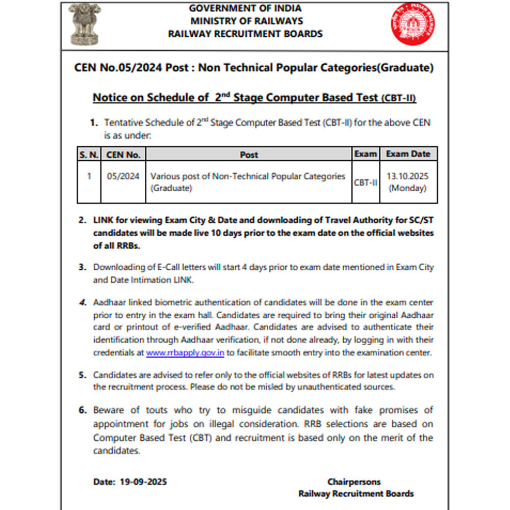 RRB NTPC 2025 CBT 2 Exam Date : RRB NTPC 2025 CBT 1 పరీక్ష ఫలితాలు సెప్టెంబర్ 19న విడుదల కాగా, CBT 2 పరీక్షను అక్టోబర్ 13, 2025న నిర్వహించనున్నారు. CBT 1లో అర్హత సాధించిన అభ్యర్థులకు CBT 2 పరీక్షకు హాజరయ్యేందుకు అవకాశం ఉంది. అడ్మిట్ కార్డులు పరీక్షకు 4 రోజుల ముందు (అక్టోబర్ 9) అధికారిక వెబ్సైట్లో అందుబాటులో ఉంటాయి, అలాగే సిటీ ఇన్టిమేషన్ స్లిప్లు 10 రోజుల ముందు అంటే అక్టోబర్ 3న విడుదల అవుతాయి.