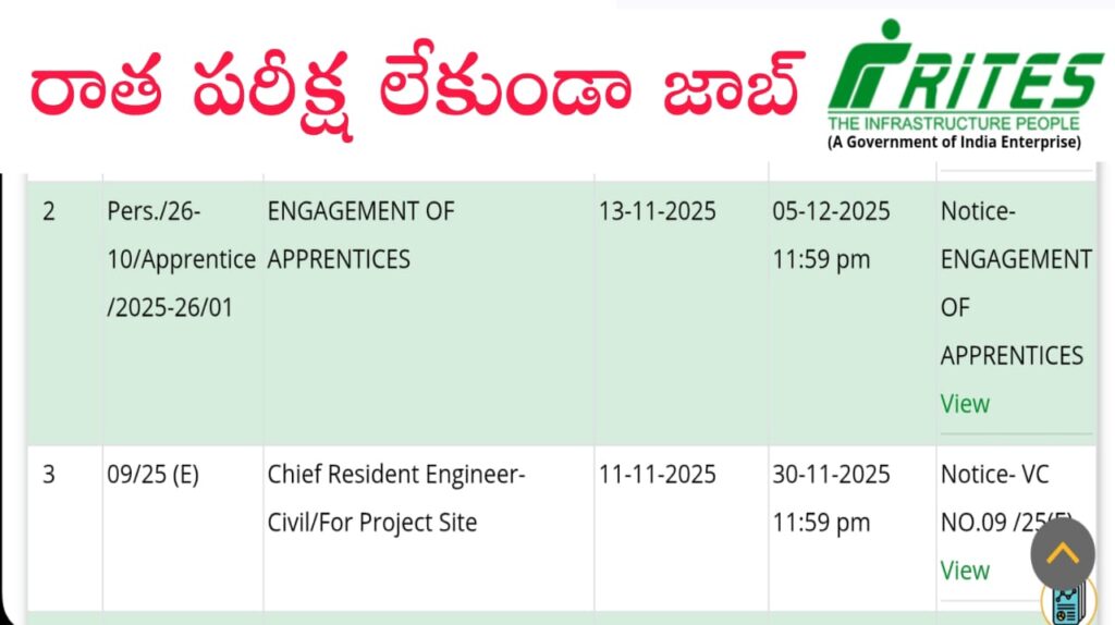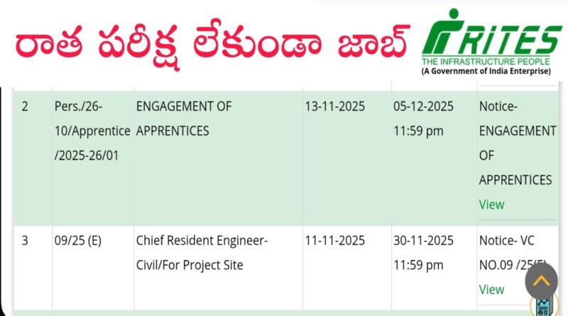 ఆసక్తి గల అభ్యర్థులు అధికారిక వెబ్సైట్ https://www.rites.com లో కి వెళ్లండి.”Recruitment” లేదా “Job Opportunities” సెక్షన్లో అడిగిన అప్రెంటిస్ పోస్టులు చూడండి.
