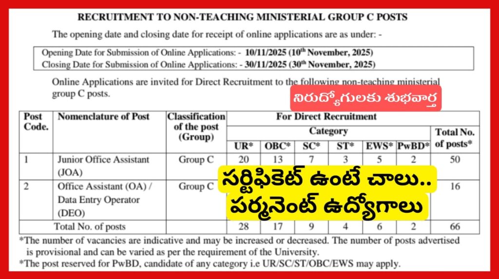 •జూనియర్ ఆఫీస్ అసిస్టెంట్ (JOA) & ఆఫీస్ అసిస్టెంట్ (OA)/డేటా ఎంట్రీ ఆపరేటర్ (DEO) ఉద్యోగాలు ఉన్నాయి. మొత్తం 66 పోస్టులు భర్తీ.