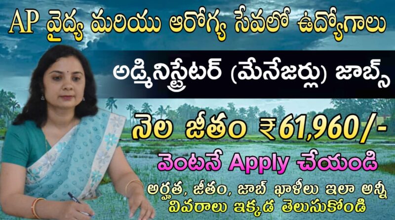 ఆంధ్రప్రదేశ్ లో వివిధ జిల్లాలలో డైరెక్టర్ ఆఫ్ మెడికల్ ఎడ్యుకేషన్, A.P. నియంత్రణలో ఉన్న హాస్పిటల్ అడ్మినిస్ట్రేటర్ (మేనేజర్లు) పోస్టులను కాంట్రాక్ట్ ప్రాతిపదికన  08 (ఎనిమిది మాత్రమే)లో భర్తీ కోసం కొత్త నోటిఫికేషన్ విడుదల చేశారు. ఈ నోటిఫికేషన్ లో రూ.61,960/- నెల జీతం ఇస్తారు. రాత పరీక్ష లేకుండా ఇంటర్వ్యూ ఆధారంగా సెలక్షన్ చేస్తున్నారు. అప్లై చేస్తే సొంత జిల్లాలో ఉద్యోగం వచ్చే అవకాశం ఉంది. APMSRB వెబ్‌సైట్ (https://apmsrb.ap.gov.in/msrb) లో మాత్రమే ఆన్‌లైన్‌లో దరఖాస్తు చేసుకోవాలి.