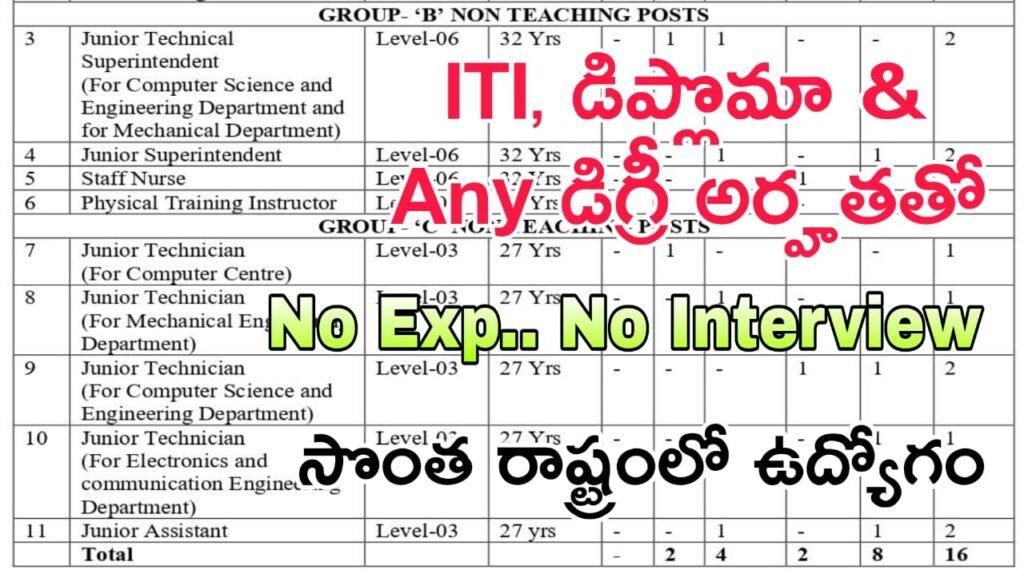 ఇది ఒక ఇండియన్ ఇన్స్టిట్యూట్ ఆఫ్ ఇన్ఫర్మేషన్ టెక్నాలజీ డిజైన్ అండ్ మాన్యుఫ్యాక్చరింగ్ (IIITDMK) నుండి విడుదల చేసిన నోటిఫికేషన్. ఈ నోటిఫికేషన్ ద్వారా జూనియర్ అసిస్టెంట్, జూనియర్ టెక్నీషియన్, ఫిజికల్ ట్రైనింగ్ ఇన్స్ట్రక్టర్, స్టాఫ్ నర్స్, జూనియర్ సూపరింటెండెంట్ తదితర.. పోస్టుల కోసం దరఖాస్తులు చేయనున్నారు. బ్యాచులర్స్ డిగ్రీ, డిప్లమా, ఐఐటీ, బిఎస్సి, ఇంజనీరింగ్ తదితర…. అర్హతలు ఉన్న ప్రతి ఒక్కరికి ఉద్యోగ అవకాశాలు ఉన్నాయి. వయసు 18 సంవత్సరాలు నుంచి 45 మధ్యలో కలిగి ఉండాలి. అప్లై చేస్తే పర్మినెంట్ ఉద్యోగం పొందవచ్చు. ఇలాంటి అవకాశం మళ్ళీ రాదు అర్హులు అయితే వెంటనే ఆన్లైన్లో అప్లై చేసుకోండి. అధికారిక వెబ్సైట్ www.iiitk.ac.in. లో ఆన్లైన్ లో 24 జనవరి 2026 లోపు అప్లై చేసుకోవాలి. ఇందులో రెండు తెలుగు రాష్ట్రాల అభ్యర్థులు కూడా అప్లై చేసుకోవచ్చు.