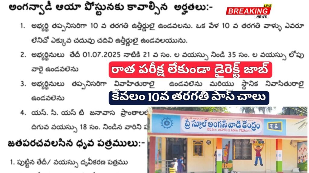 1. అంగన్వాడీ కార్యకర్త, అంగన్వాడీ ఆయా పోస్టునకు తప్పనిసరిగా 10వ తరగతి పాస్ అయి ఉండవలెను. వివాహితురాలై ఉండవలెను మరియు స్థానిక నివాసితురాలై ఉండవలెను.