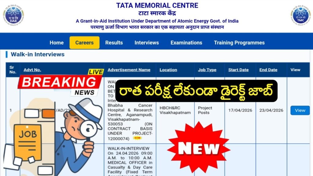 ప్రకటన పేరు: వాక్-ఇన్ ఇంటర్వ్యూ, తేదీ: 23.04.2026 ఉదయం 09:30 నుండి 10:30 గంటల మధ్య, ఇంటర్వ్యూ వేదిక: హోమీ భాభా క్యాన్సర్ హాస్పిటల్ & రీసెర్చ్ సెంటర్, అగనంపూడి, విశాఖపట్నం-530053.