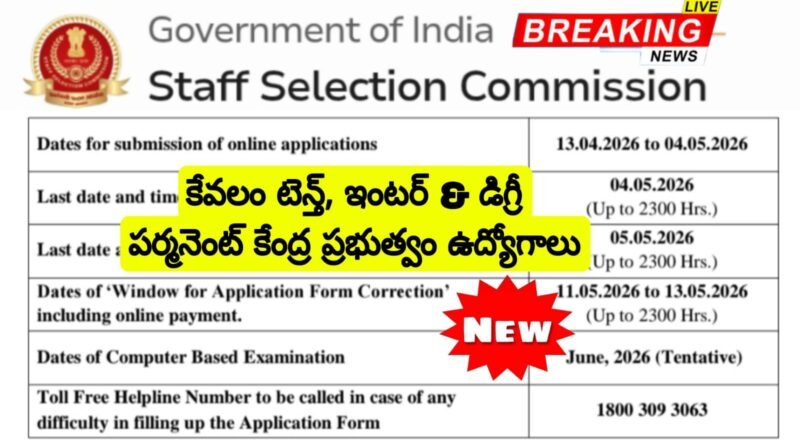 ఇది ఒక స్టాఫ్ సెలెక్షన్ కమిషన్ (SSC) నుండి విడుదల చేసిన నోటిఫికేషన్. ఈ నోటిఫికేషన్ ద్వారా స్టేనోగ్రాఫర్ గ్రేడ్ ll, లేబరేటరీ అసిస్టెంట్, జూనియర్ ఇంజినీర్, సైంటిఫిక్ అసిస్టెంట్, డ్రిల్లింగ్ అసిస్టెంట్, స్టోర్ క్లర్క్, అకౌంటెంట్, స్టోర్ అటెండెంట్, టైలర్, టెక్నీషియన్ తదితర.. పోస్టుల కోసం దరఖాస్తులు చేయనున్నారు. 10th లేదా దానికి సమానమైన అర్హతలు, ఇంటర్ మరియు ఆపై చదివి ఉత్తీర్ణులైన ప్రతి ఒక్కరికి ఉద్యోగ అవకాశాలు ఉన్నాయి. వయసు 18 సంవత్సరాలు నుంచి 35 మధ్యలో కలిగి ఉండాలి. అప్లై చేస్తే పర్మినెంట్ ఉద్యోగం పొందవచ్చు. ఇలాంటి అవకాశం మళ్ళీ రాదు అర్హులు అయితే వెంటనే ఆన్లైన్లో అప్లై చేసుకోండి. అధికారిక వెబ్సైట్ https://ssc.gov.in/home లో ఆన్లైన్ లో 04 మే 2026 లోపు అప్లై చేసుకోవాలి. ఇందులో రెండు తెలుగు రాష్ట్రాల అభ్యర్థులు కూడా అప్లై చేసుకోవచ్చు.