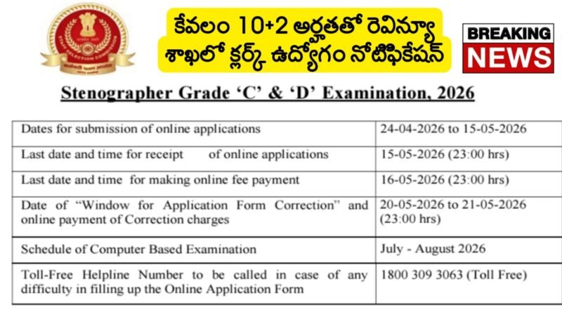 SSC Stenographer Vacancy Details Notification 2026 Apply Online Now : భారతదేశంలో ప్రభుత్వ ఉద్యోగాల కోసం ఎదురు చూస్తున్న నిరుద్యోగ యువతకు సువర్ణావకాశం లభించింది. భారత ప్రభుత్వం సిబ్బంది, ప్రజా ఫిర్యాదులు మరియు పెన్షన్ల మంత్రిత్వ శాఖ, సిబ్బంది మరియు శిక్షణ విభాగం, స్టాఫ్ సెలెక్షన్ కమిషన్ (SSC) నుండి కింది పోస్టుల కోసం అర్హత కలిగిన భారతీయుల నుండి నిర్ణీత ఫార్మాట్లో ఆన్లైన్ దరఖాస్తులు ఆహ్వానించబడ్డాయి. స్టెనోగ్రాఫర్ గ్రేడ్ ‘సి’ (గ్రూప్ ‘బి’, నాన్-గెజిటెడ్) మరియు స్టెనోగ్రాఫర్ గ్రేడ్ ‘డి’ (గ్రూప్ ‘సి’) తదితర.. పోస్టులను భర్తీ చేస్తూ దరఖాస్తులను ఆహ్వానిస్తుంది. ఈ పోస్టులకు అప్లై చేసుకోవడానికి చివరి తేదీ 15 మే 2026 లోపల https://ssc.gov.in/ అధికారిక వెబ్సైట్ ద్వారా ఆన్లైన్ లో అప్లై చేసుకోవాలి.