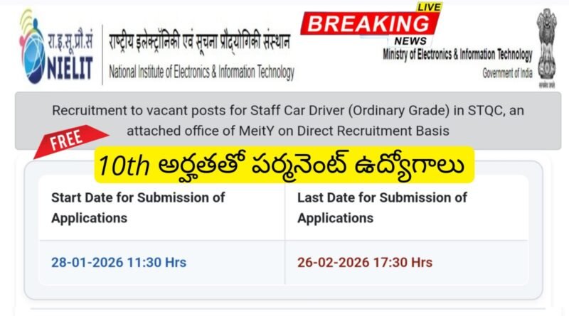 Read More10th అర్హతతో పెర్మనెంట్ గ్రూప్ సి స్టాఫ్ కార్ డ్రైవర్ ఉద్యోగ నోటిఫికేషన్ వచ్చేసింది| Latest NIELIT Recruitment 2026 Apply Now Latest NIELIT Recruitment